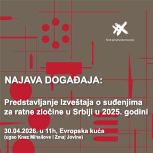 Fond za humanitarno pravo vas poziva na predstavljanje Izveštaja o suđenjima za ratne zločine u Srbiji u 2025. godini u četvrtak 30. aprila 2026. godine u 11:00 časova, Evropska kuća (Ugao Knez Mihailove i Zmaj Jovine).