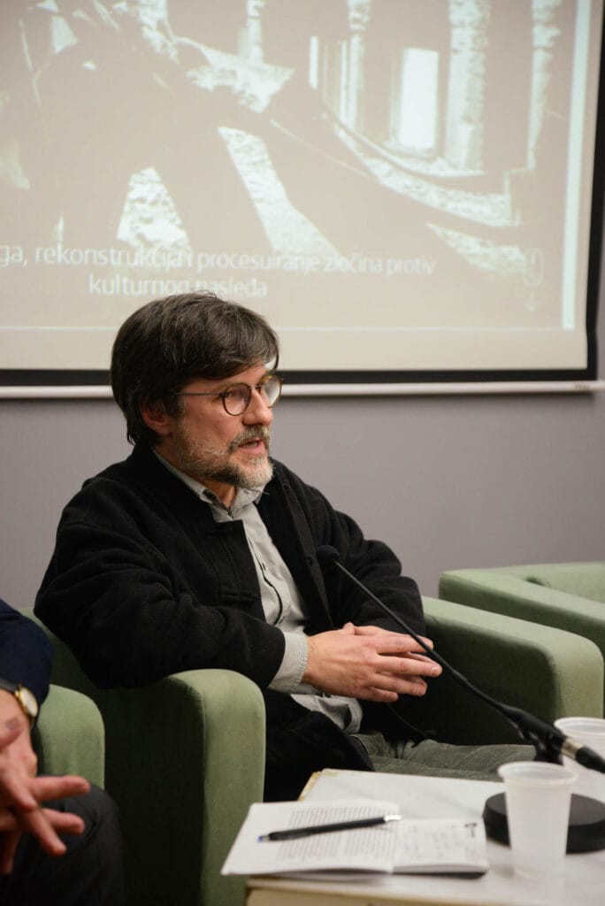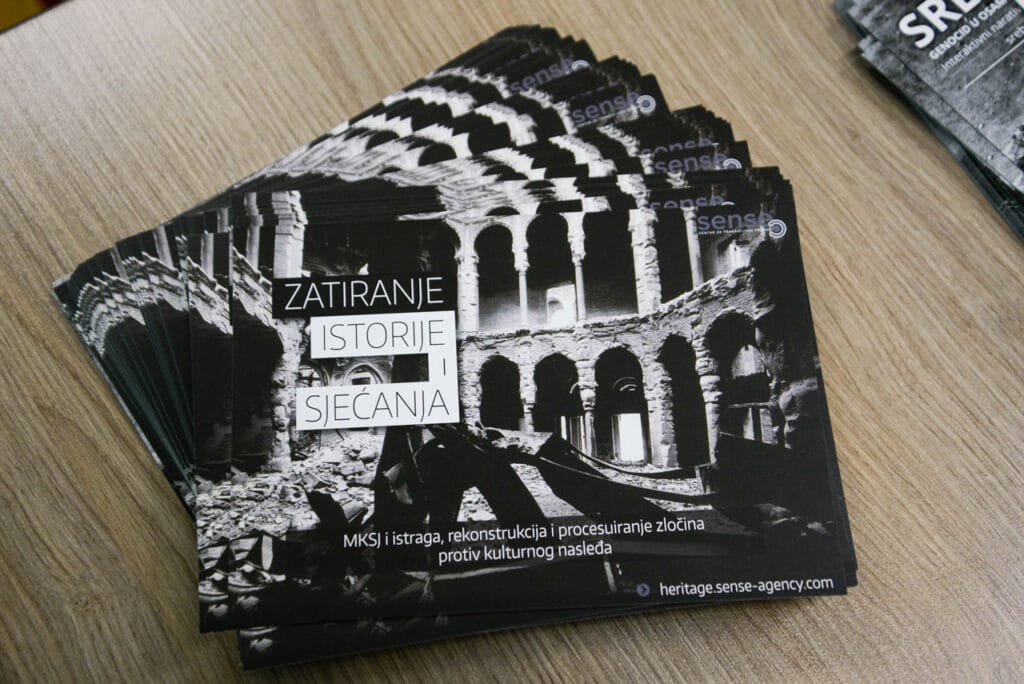 Direktor SENSE Mirko Klarin je najpre prikazao deo narativa o uništavanju objekata sve tri veroispovesti u Jajcu, mestu koje nosi simboliku nekadašnje zajedničke države; a koja do danas nisu procesuirana. Usledili su segmenti narativa koji se odnose na uništavanje kulturne baštine u Dubrovniku, sarajevskoj Vijećnici, Starom mostu u Mostaru, te širom Bosne i Hercegovine i Kosova. Klarin je posebnu pažnju posvetio primerima uništavanja kulturne baštine koji do danas nisu procesuirani. On je naglasio da je u procesima pred MKSJ prioritet stavljen na verske objekte, jer je njihovo uništavanje upravo dokazivalo diskriminatornu praksu ratovanja i olakšalo dokazivanje zločina protiv čovečnosti na koje je MKSJ prevashodno bio usmeren. Ograničene domete MKSJ-a, koji nije procesuirao sve zločine nad kulturnim nasleđem, nisu nadomestila ni nacionalna suđenja, izuzev nekoliko optužnica u BiH, postupka u Srbiji zbog paljenja Bajrakli džamije u Beogradu 2004. godine i tek nekoliko procesuiranih osoba na Kosovu, ali zbog uništavanja srpskih pravoslavnih objekata 2004. godine.